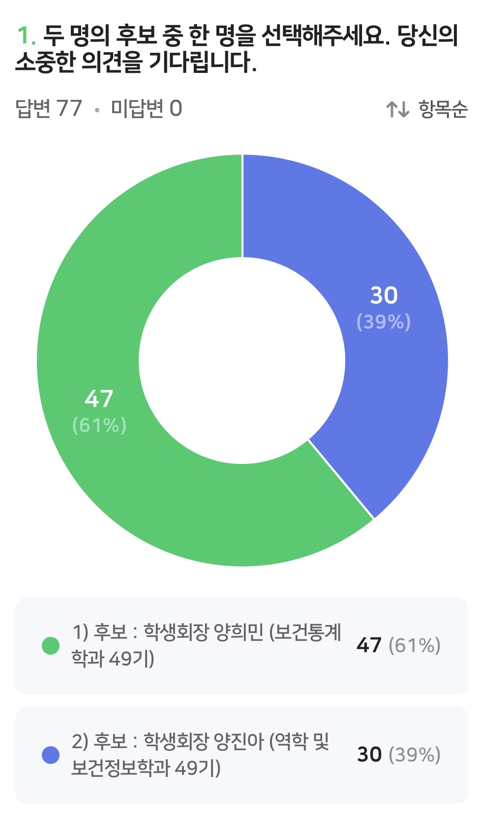 제27대 총학생회장 | 양희민 (보건통계학과) 양진아 (역학 및 보건정보학과) | 147명 | 77명 | 47표 (61%) | 30표 (39%) | 양희민 (보건통계학과) 당선 |