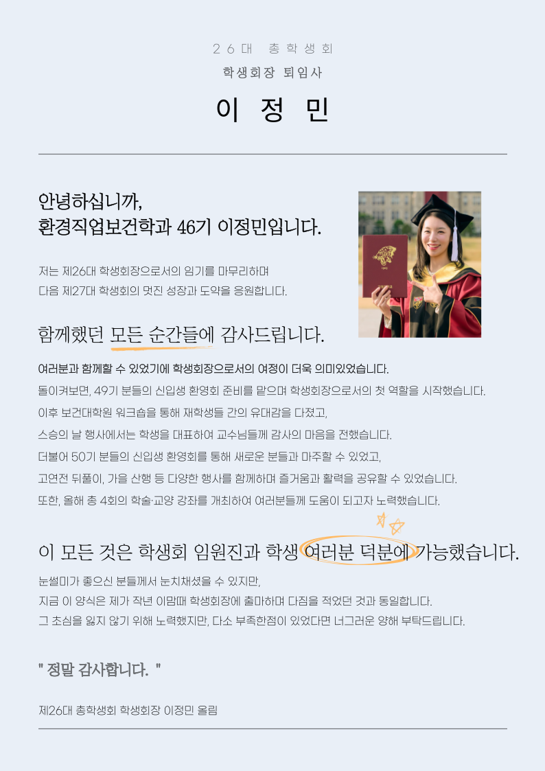 저는 26대 학생회장으로서의 임기를 마무리하며 다음 27대 학생회의 멋진 성장과 도약을 응원합니다.