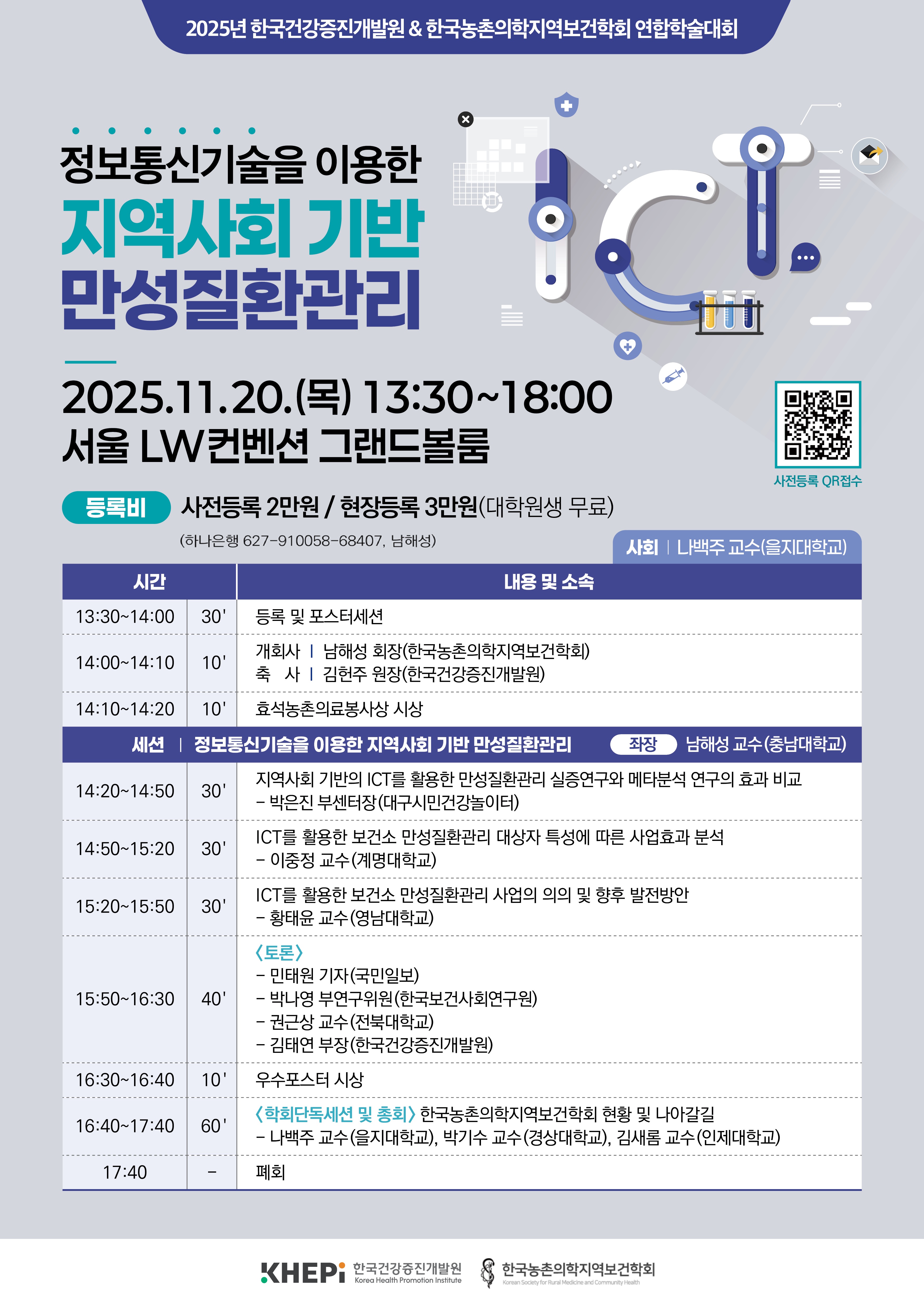 2025년 한국건강증진개발원&한국농촌의학지역보건학회 연합학술대회 안내 가. 일 시 : 2025년 11월 20일(목) 13:30 ~ 18:00 나. 장 소 : 서울 LW컨벤션 그랜드볼룸 다. 주 제 : 정보통신기술을 이용한 지역사회 기반 만성질환관리 라. 사전등록 및 포스터 초록 접수 안내 등록 및 접수기간 2025년 11월 12일(수) 까지 사전등록방법 네이버폼 작성 후 제출 ①웹포스터 내 QR코드 ②URL 링크(https://naver.me/GXgx7QYI) 등록비 - 사전등록: 2만원 / 현장등록: 3만원 - 입금계좌: 하나은행 627-910058-68407 (예금주: 남해성) - 한국건강증진개발원 소속 및 대학원생: 참가비 무료 포스터 초록 제출 - 제출처: kosocham@naver.com 이메일 제출 - 1차 2025년 11월 2일 (일) - 2차 2025년 11월 12일 (수) 제출서류 - 초록 제출 양식(붙임2) - e포스터, 자료공유 동의서, 구연동영상(3분이내) ※ 초록은 사전심사로 진행, 2차 서류는 선정된 초록에 대해 대상자에게 사전연락 ※ 최우수상 1편, 우수상 2편, 장려상 7편 수상 예정